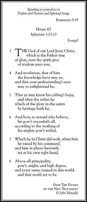 Here, in conclusion, is an original rendering into verse from the Authorized Version, which presents essential parts of the new testament in the purest scriptural form from the book of Acts through to that of Revelation. In these hymns the very words of the new testament are set into verse with as little alteration as possible, so that the singer may feel that it is the scripture itself that is being sung. This must be very near to what the apostles meant by ‘hymns’ in the new testament, and to what was actually sung by the church in the beginning.